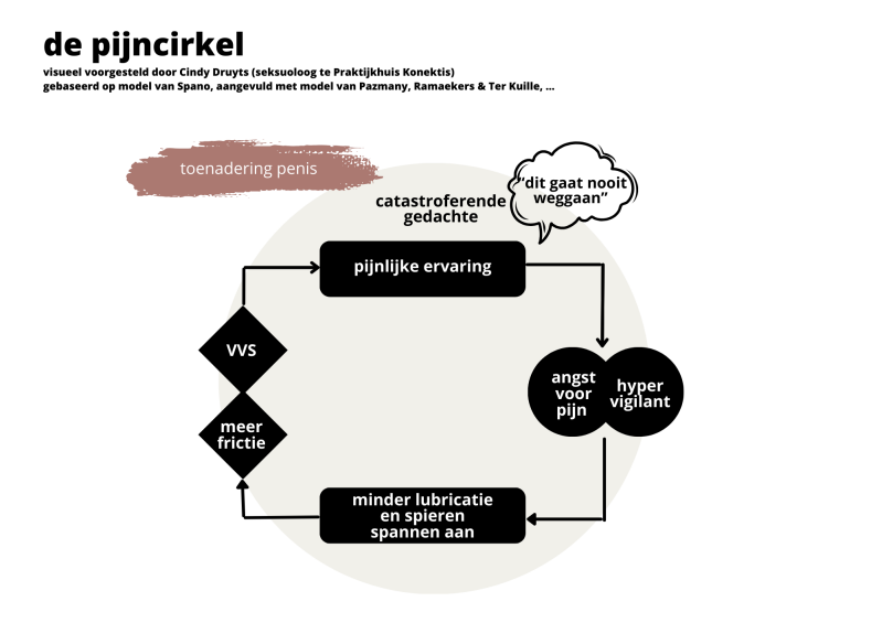 5. Er kan sprake zijn van VVS, ook wel (provoked) vulvodynie genoemd, oppervlakkige dyspareunie of vestibulitis. Er is een irritatie aan de vulvaire huid, vaak gaat het over een branderig gevoel. Een volkomen normale reactie gezien de eerdere stappen in deze pijncirkel.